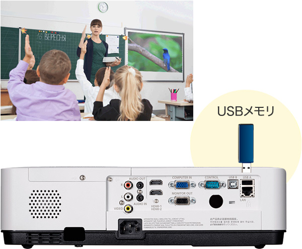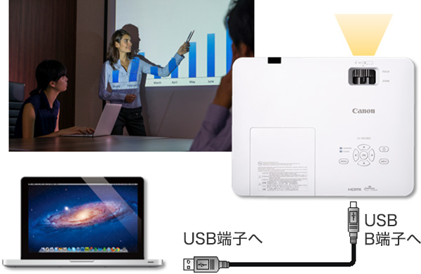 また、USBケーブルによる映像表示にも対応。ご利用環境に応じた投写を実現します。