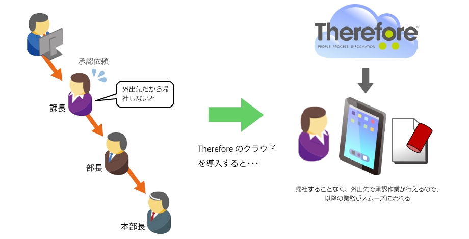 Thereforeのクラウドに文書を保管しておくことで、専用モバイルアプリからどこからでもアクセスが可能になります。急を要する場合に、わざわざ帰社したり、資料のメール送信を依頼する必要がなくなります。ワークフローの承認もモバイルから行うことができるので、急ぎの案件も迅速に対応することができます。