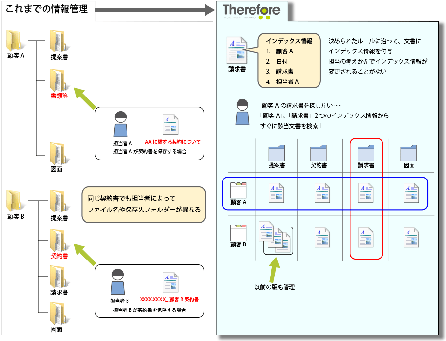 文書をインデックス構造で保管しておくと、インデックス情報を利用して、誰でもいつでも同じように検索が行えます。また、インデックスは複数登録ができるので、インデックスを組み合わせて検索を行うと目的の文書を簡単に特定することができます。