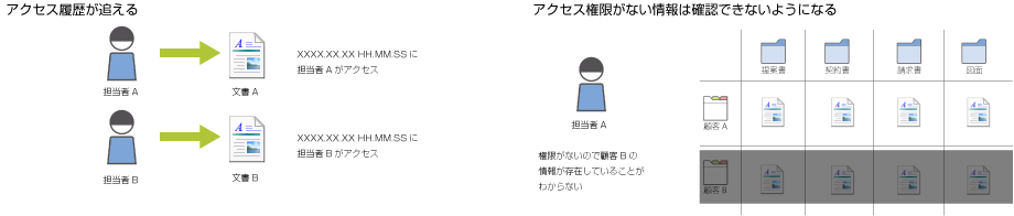誰がいつどの文書にアクセスしたか履歴や文書の変更履歴を追うことができます。また、細やかに操作権限管理ができるので、より強固なセキュリティーを施すことができ、情報漏洩を防ぐことができます。