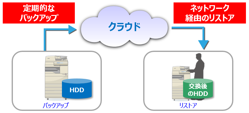 複合機のHDD上に保持している重要なデータを定期的にクラウド上にバックアップし、故障等でHDD交換が必要となった場合にクラウド上からリストアを行う無償のサービスです。