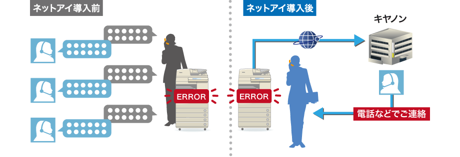 キヤノン専任オペレーターがオンラインで常にお客さまのオフィス機器を見守ります。複合機やプリンターの紙づまりやエラー発生時に監視基準と合致した場合、お客さま(機器の設置先)へお電話にて状況を確認し、復旧サポートを行います。