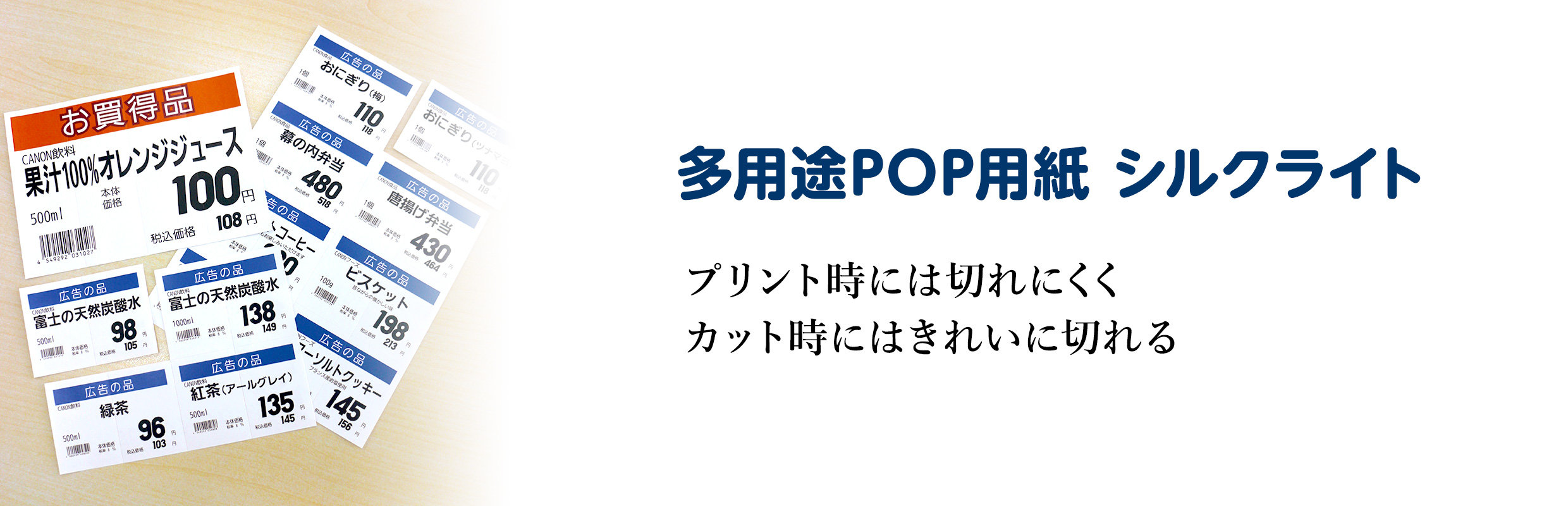 多用途POP用紙 シルクライトは、プリント時には切れにくく、カット時には折り曲げるだけできれいに切れるPOP用紙の定番品です。安心して使えるので、各種主要フルカラープリンターで豊富な実績があります。