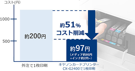 キヤノンは1枚インクコスト約2円※~。外注するより安いのはもちろん、一般的な昇華型方式のカードプリンターよりも、低コストでプラスチックカードがつくれます。