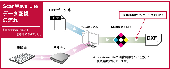 (紙図面をスキャンしてできた)TIFFなどのラスタデータを、ScanWave Liteでベクターデータに変換。