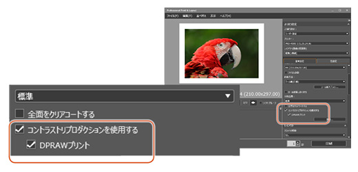 DPRAWプリントは「コントラストリプロダクションを使用する」をチェックすることで有効となります。