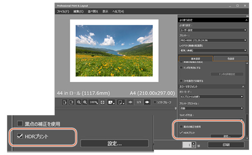 Professional Print&Layoutの「HDRプリント」は、Digital Photo ProfessionalでHDRモニターに表示されている見え方に近づくようプリントします。RAW画像と広い色域を持つプリンターが連携することによって、RAW画像が本来持っている色をより忠実に再現することができます。