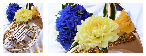 Adobe® RGBで撮影した写真(左)と、その写真をsRGBに変換した場合に色域を超えて再現しきれない部分を抜き出したもの(右)の比較。右の画像のうち、色がついている箇所がsRGBの色域を超えてしまっている部分で、明るく彩度の高い緑~青にかけて特に顕著に現れている。ただし、黒く塗りつぶされた部分はsRGBの範囲内で、画面全体の多くはsRGBの色域内であることが分かる。