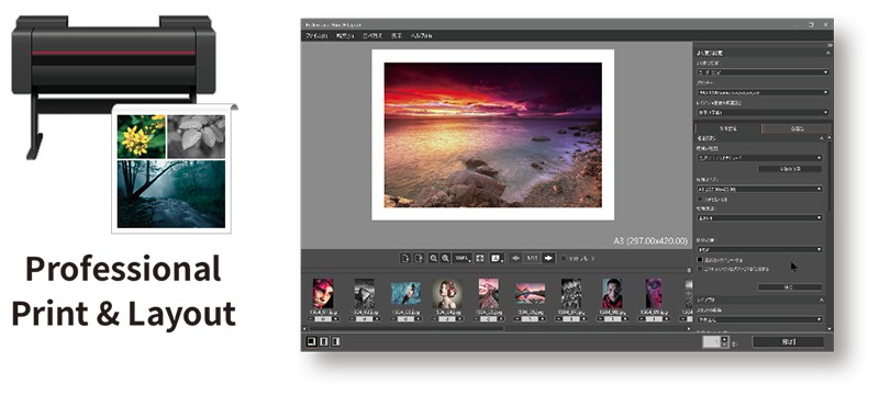 imagePROGRAF Proシリーズ専用ソフトウェア「Professional Print&Layout」はRAW現像ソフトウェアCanon Digital Photo Professionalや画像処理ソフトウェアのPhotoshop®、Photoshop® Elements、Lightroom Classic®からの出力に対応したソフトで、それぞれのソフトのプリント機能にかわり、統一されたインターフェースによりプリントの効率を大幅に向上します。