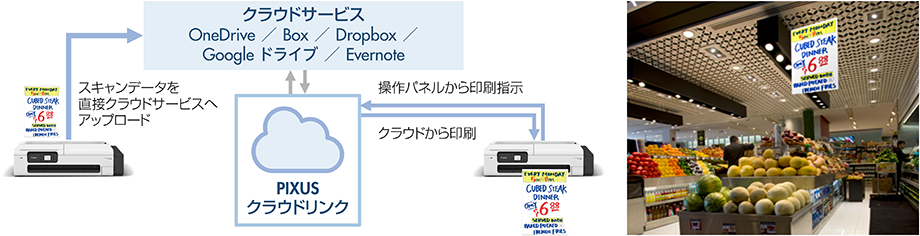 PCレスでスキャンデータを共有することとクラウド上にあるコンテンツを大判プリントすることが可能です。