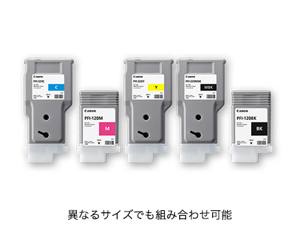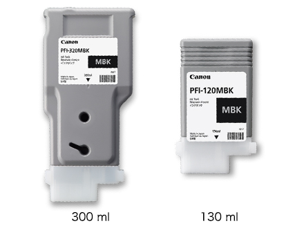 130mlと300mlの2種類の容量のインクタンクを用意。プリントボリュームに応じて適切な容量のインクタンクを選択可能です。また、各色の使用頻度に応じて、異なるサイズでも組み合せて使用できます。