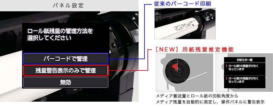 TXシリーズは、バーコードによる正確な用紙残量管理に加え、新たにバーコード印刷が不要の用紙残量推定機能を搭載。この新機能は、用紙の搬送量とロールの回転角度から用紙の残量を推定し、残量が少なくなると操作パネルで警告を表示します。ユーザーのニーズに合わせて管理方法を選択することができ、バーコード印刷にともなう処理時間やインク、用紙の消費を削減できます。