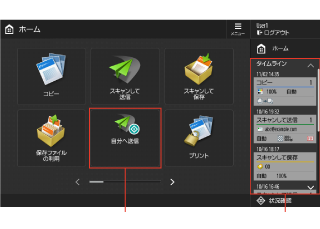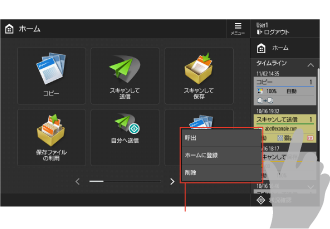 定型業務のショートカットとして、自分専用の「マイボタン」やユーザー間の「共有ボタン」を「ホーム」画面上に配置。ワンタッチでジョブを実行可能です。また、各ファンクションで実行したジョブを「タイムライン」に時系列で表示。「タイムライン」をタッチすることで、一度実行したジョブを簡単に再実行できます。
