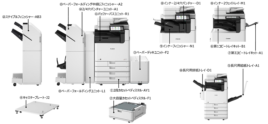 | 第1コピートレイキット・B1/第3コピートレイキット・A1 | 第1コピートレイキット・B1/インナー2ウェイトレイ・M1 | インナーフィニッシャー・N1 | ステイプルフィニッシャー・AB3 | ペーパーフォールディング中綴じフィニッシャー・A2 | ||