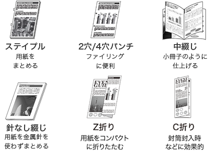 | サドル折り(未綴じ)※5 | V折※5 305×457mm、A3、A4R、B4:1枚折(52~256g/m2)/重ね折 2~5枚(52~105g/m2) C折(内三つ折り)※5 A4:1枚折(52~256g/m2)/重ね折 2~6枚(52~90g/m2)/重ね折 2~5枚(91~128g/m2) A3、B4:1枚折(64-256g/m2)/重ね折 2~5枚(64~128g/m2) |