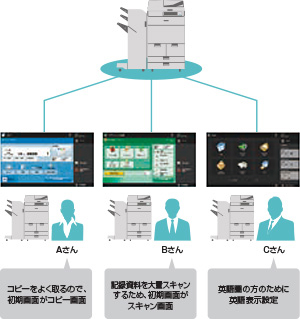 初期画面や表示言語を自分用にカスタマイズし、使いやすいように個別の設定を登録、さらに、自分専用または所属グループのアドレス帳を表示できます。コピーをよく取る人はコピー画面を初期画面に。大量にスキャンする人はスキャン画面を初期画面に。英語圏の人は英語表示に。一人ひとりのワークフローに柔軟に対応し、業務効率を高め、生産性の向上に貢献します。また、同一ネットワーク内の一台をサーバーとして、他のiR-ADVに設定を同期することも可能。業務のさらなる効率化と管理者の負荷軽減にも貢献します。
