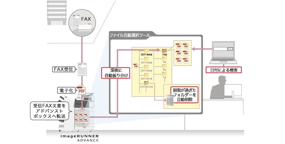 imageRUNNER ADVANCEのアドバンスドボックスに格納された受信ファクス文書を日付ごと作成されるフォルダーに自動的に振り分け保存。受信ファクス文書の電子化を効率的に行ないます。