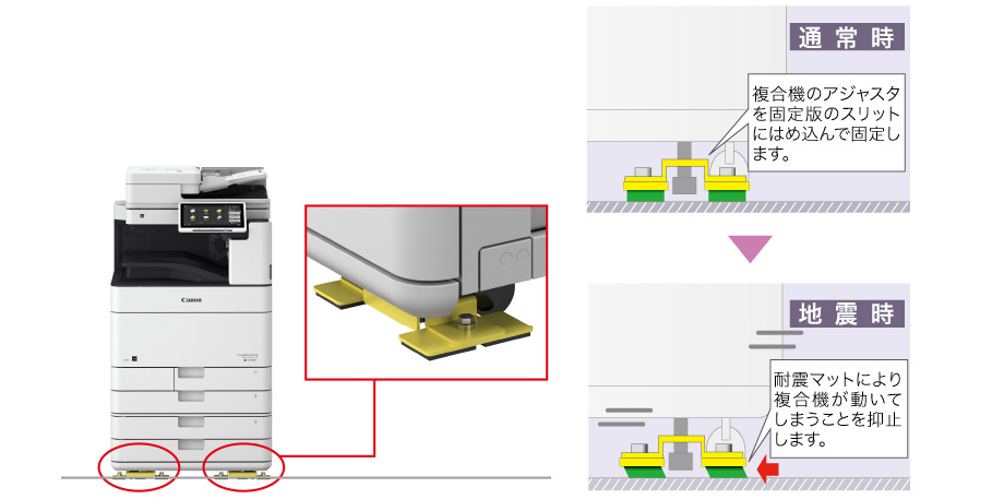 耐震マットと板金を組み合せて震度7相当※までの地震でオフィス向け複合機の移動を防止します。
