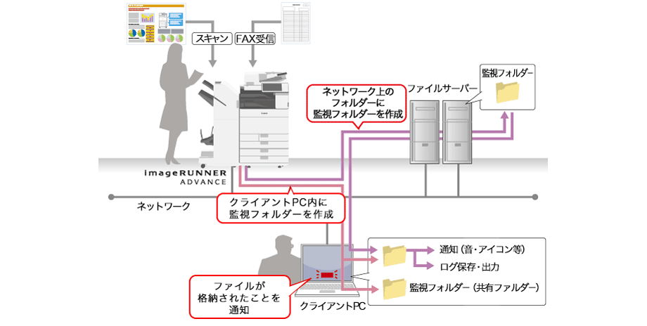 ファイル格納通知ツールをパソコンにインストールし、監視フォルダーを指定しておくことにより、ファイルが監視フォルダーに収納されると、ファイル格納通知ツールが即座に反応。ファイルが送信されたことを音やバルーンなどでお知らせするので、遅延なく処理することができます。