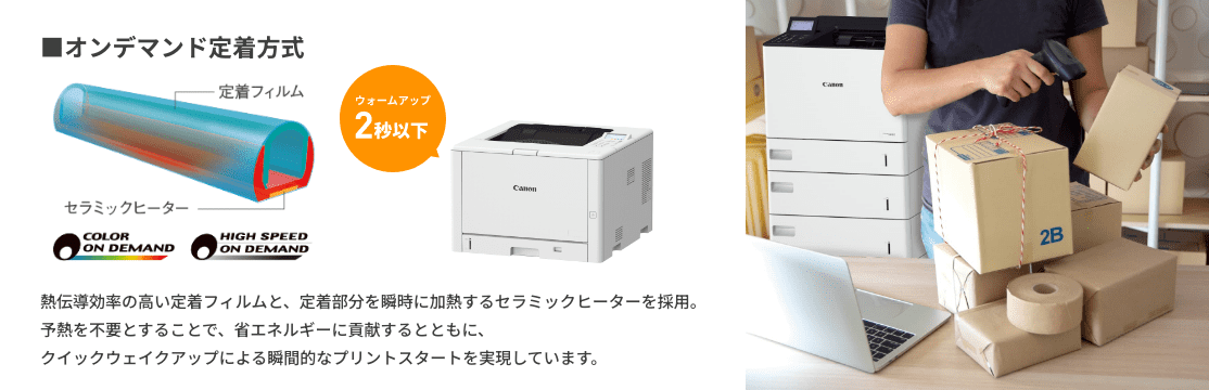 定着器を瞬時に加熱する「オンデマンド定着方式」を採用。すばやく起動し、送り状や納品書を印刷できます。また、毎分45枚の高生産性(※)で、大量の送り状や納品書もスピーディに印刷できます。 ※LBP463iの場合