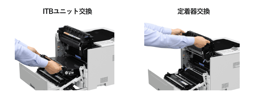 従来機ではカスタマーエンジニアによる交換が必要でしたが、お客様自身で交換いただくことで、カスタマーエンジニア訪問を待たず印刷を再開できます。