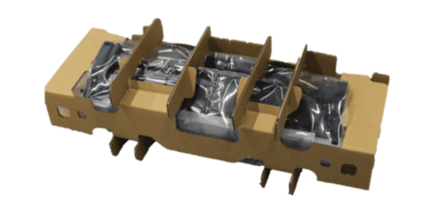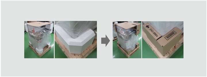 従来のプラスチック材料からダンボール材へ変更。紙材料でありながら緩衝性の高い技術設計を行い、強度の確保と梱包材の小型化・軽量化を両立しました。技術と仕組みにより、製品のライフサイクル全体で環境負荷の最小化を推進しています。