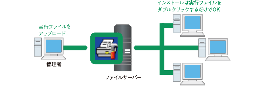 管理者が制作した「実行ファイル」を共有サーバーにアップロード。各ユーザーがダブルクリックするだけで、プリンタードライバーのインストールが行えます。複数のPC、支社など遠隔地にあるPCにも、管理者が意図するプリンター設定がスムーズに行えます。