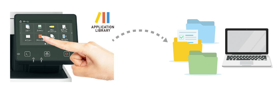 使用頻度の高い操作や便利な機能を、ホーム画面に登録し、ボタンひとつで実行できる機能です。例えば、繰り返し使う文書を登録しておくことで、パソコンを起動しなくても印刷が可能。時間短縮や作業精度の向上につながります。