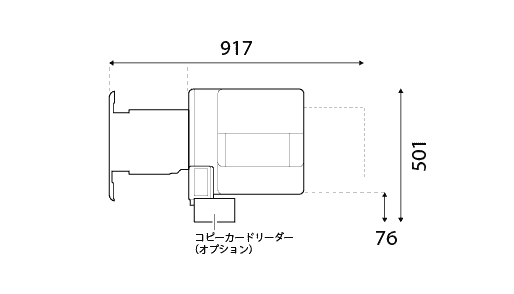ADF、操作パネル、排紙トレイ、給紙カセットを閉じた時の寸法。