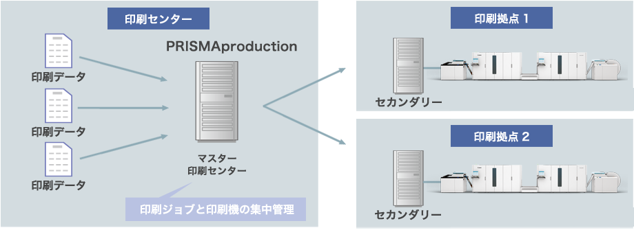 多拠点で運用する大規模な印刷システムに対しても、マスター&セカンダリーのサーバー構成でシステム構築でき、センターでの効率的集中管理が可能です。