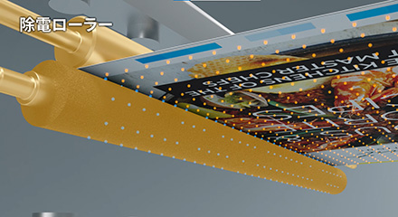 上質紙やコート紙など抵抗の低い用紙には用紙の表面、裏面両方からイオナイザーにより+と-のイオンを発生し中和させ除電します。