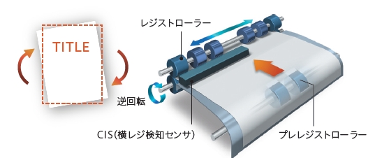 搬送されてきた用紙の先端をレジストローラーに突き当てて斜行を補正するとともに、ループを作成。用紙の端をCIS(横レジ検知センサ)で検知しループを維持しながら左端レジ補正を行います。さらに機内の温度変化をセンシングし、転写タイミングを一定に制御することで、より精度の高い表裏見当を実現しました。