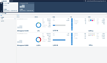 複数台のプリンターの稼働実績や出力実績を自動的にクラウドに集約し、PCのブラウザ上で閲覧できる管理者向けサービスです。日/週/月ごとの推移をグラフ化し、稼働傾向の変化や繁忙期と閑散期のばらつきなどを可視化し、感覚に頼らない正確な情報を閲覧できます。
