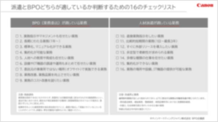 本資料では「派遣か、アウトソーシングか、検討するためのポイント」をチェックリスト形式にまとめております。