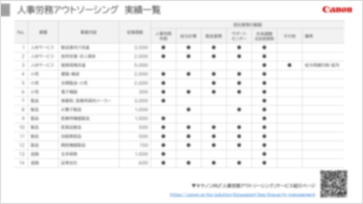 本資料では、当社が提供する人事労務アウトソーシングサービスの実績を一覧でご紹介しております。導入検討の際にお役立てください。
