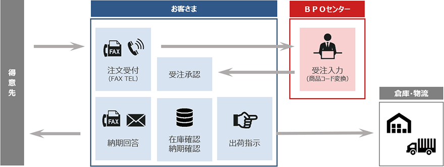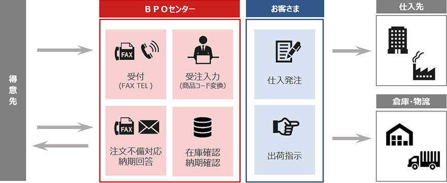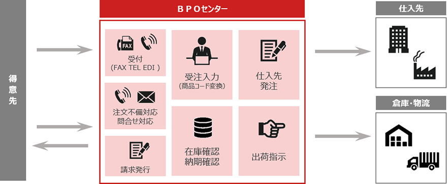 キヤノンMJの受注業務BPO(ビジネスプロセスアウトソーシング)は注文の受付から受注入力、納期回答、出荷指示、仕入先への発注、その他付随する業務処理を、BPOセンターにてお引き受けします。