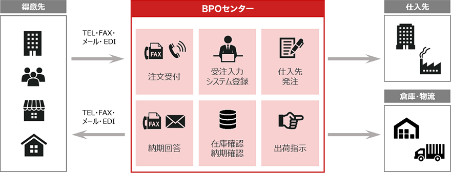 受注業務や受注に伴う発注業務を担い、得意先、仕入先、物流倉庫、製造業であれば工場などの多くの関係者とのやりとりや、その他付随する業務処理を行います。お客さまのご要望に合わせて人的リソース、業務インフラ、業務プロセスなどを、最適化し、BPOとしてご提供します。