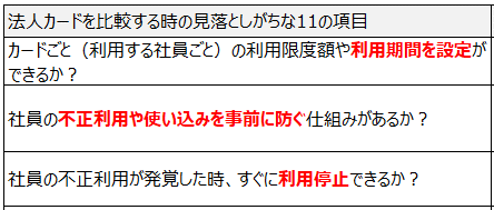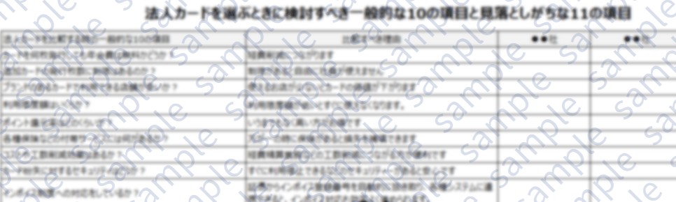 上記が比較表のイメージとなります。法人カードを選ぶときには、「年会費」「還元率」「カード発行枚数」など検討すべき項目がたくさんあります。そこでこの比較表では、どんな項目で比較検討すべきか?をエクセルにまとめました。特に、見落としがちな項目をリストアップしているので、ぜひご参照ください。