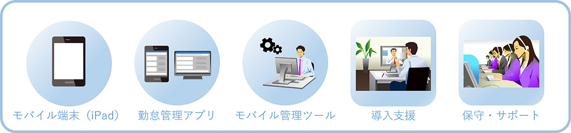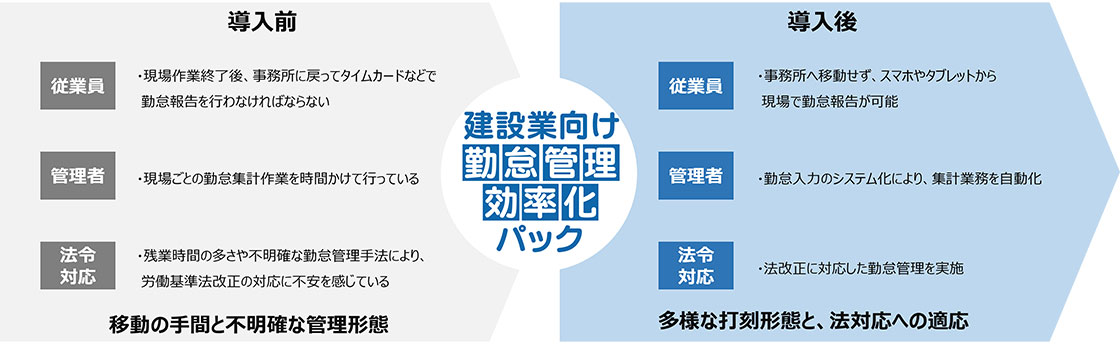 建設業向け 勤怠管理効率化パックは、改正労働基準法に準拠した効率的な勤怠管理を支援するソリューションです。現場作業員は、作業現場で勤怠管理を行うことで事務所までの移動時間を省くことができます。また管理者は、集計作業を自動化できるので業務効率を大きく向上させることができます。導入支援や保守サポートも充実しており、安心してご利用いただけます。