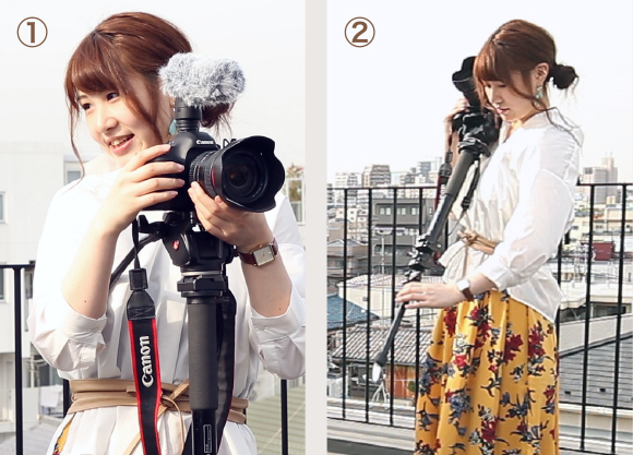 間島:最後は一脚です。準備篇で、お子さんが思いがけず動いた場合などにレールから一脚に替えると便利という話をしました。一脚にはビデオ雲台をつけてカメラを取り付けますが、構えたときにビデオ雲台のパン棒を手で握って操作しがちですが、そうすると映像がブレてしまいます。パン棒は脇にはさんで撮影してください(①)。