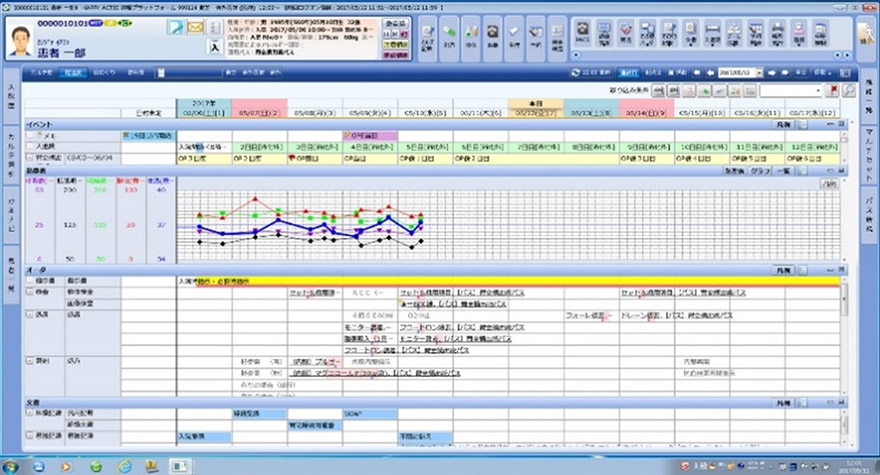 経過表は過去の治療履歴や検査結果と将来の治療計画を時間軸に沿って一覧表示ができます。イベント・経過表・検査結果・各オーダ・カルテ記載(文書)・クリニカルパスなど診療に関する情報が一画面で素早く表示できオーダなど次の指示ができるため、医療安全や業務の効率化に貢献できます。