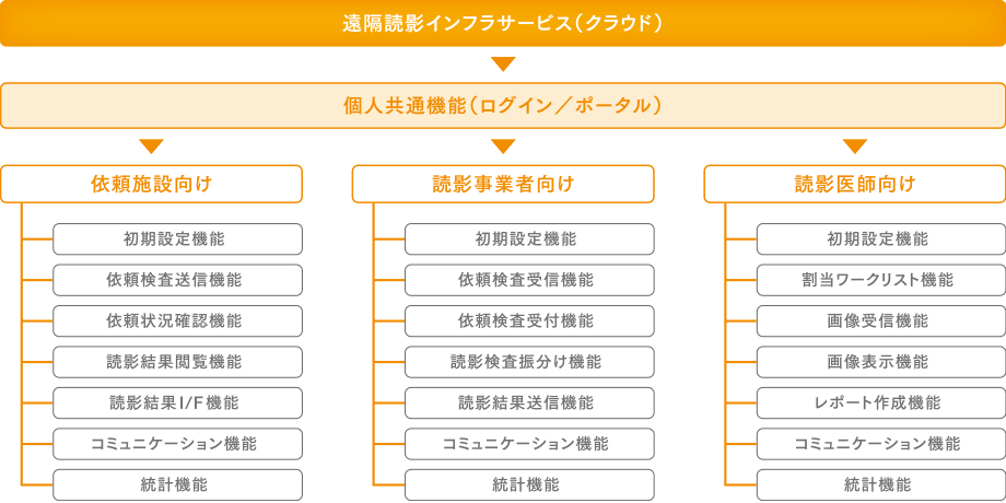 読影依頼施設がCTやMRIなどで撮影した検査画像を読影事業者が読影し、読影レポートを依頼施設に返す仕組みを提供する「遠隔読影インフラサービス」。