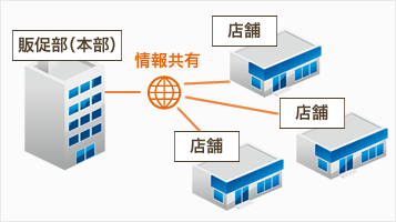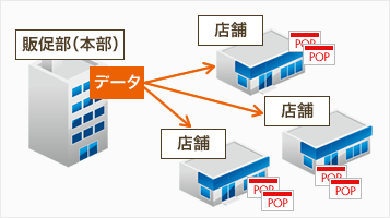 キヤノンのPOP制作システム導入によって、販促部(本部)と各店舗間でPOPデータの管理、運用、店舗でのPOP作成の効率化を進めることができます。