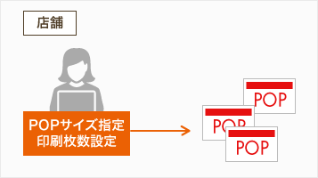 販促部(本部)が用意した各種POPデータを、店舗にあるパソコンとプリンターを使って印刷を行ないます。POPを制作する上で「本部」と「店舗」の役割を明確にすることにより、今まで煩雑だった運用を効率化し、必要サイズ、枚数、タイミングでのPOP作成が可能になります。