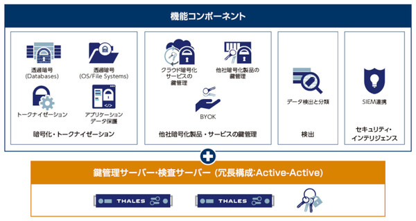 CDSPは、すべての暗号鍵をセキュアに一元管理する「鍵管理サーバー」と、透過暗号やトークナイゼーション、クラウド暗号化サービスの鍵管理、個人情報やカード番号などを含むデータの検出(ディスカバリ)といった用途ごとの「機能コンポーネント」の組み合わせで構成される、データ保護のための統合プラットフォームである。