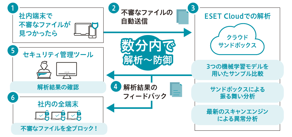 未知の脅威をクラウド上で自動解析し、数分内に自動でブロック。ESETへ報告された脅威情報も数時間内にグローバルレベルで共有されるため、ゼロデイ攻撃への対処の即時性が高まります。
