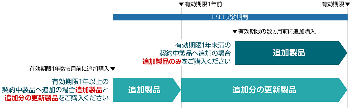 契約中製品の有効期限に揃えた追加製品と更新製品(必要な場合)をご購入いただく必要があります。有効期限が1年未満の場合は追加製品のみ、1年以上の場合は追加製品と追加分の更新製品をご購入ください。