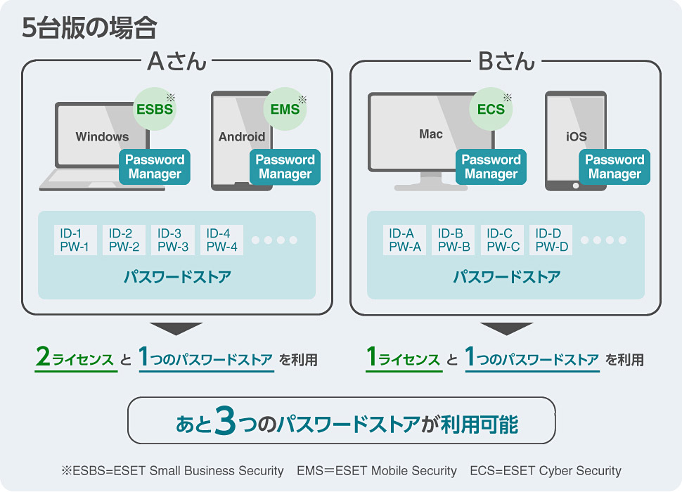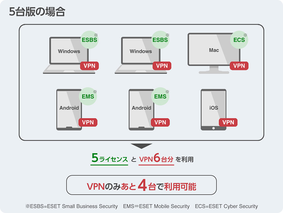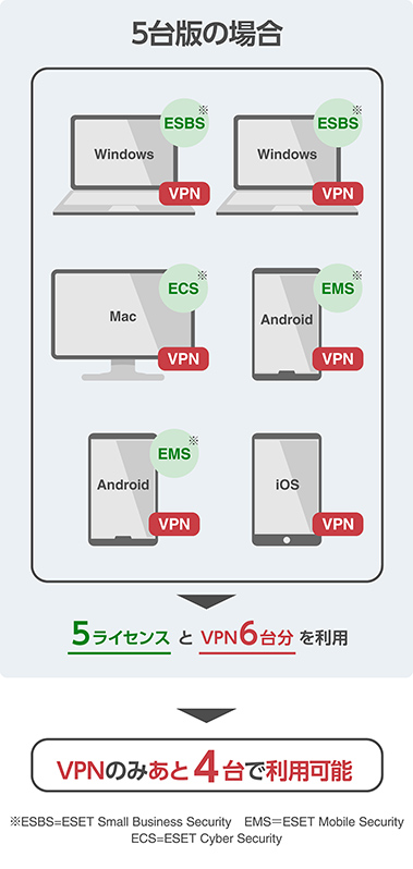 ESET スモール ビジネス セキュリティは5台版、10台版をラインアップしており、お客さまが購入した台数分のライセンスがご利用いただけます。