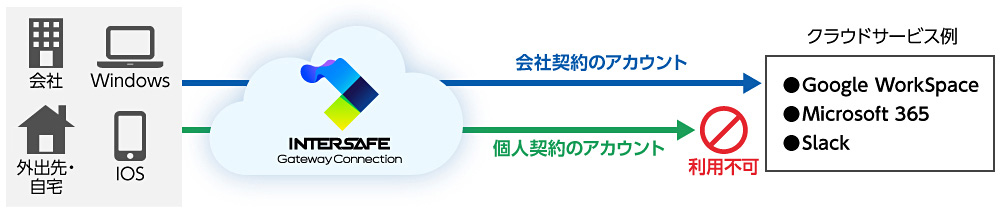 Google Workspaceを始めとした各クラウドサービスにおいて、会社契約のアカウントは利用許可しつつ、個人契約のアカウントを利用禁止にすることができ、シャドーIT対策として活用できます。