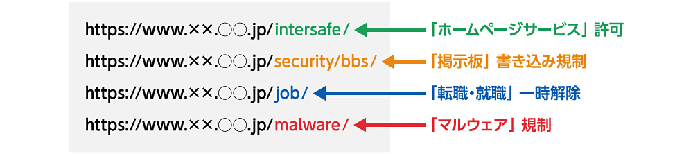 HTTPSデコード機能を使用するとパス部分も含めてカテゴリ判定が可能となり情報漏えいリスクのあるサイトを適切にフィルタリングできます。HTTPSサイトのURL単位での制御を実現します。